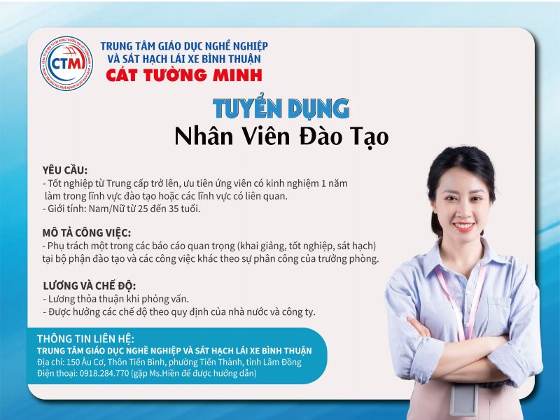 Căn cứ nhu cầu tuyển dụng nhân sự của Trung tâm năm 2025; nay Trung tâm Giáo dục nghề nghiệp và Sát hạch lái xe Bình Thuận thông báo tuyển dụng vị trí Nhân Viên phòng Đào Tạo cụ thể như sau: